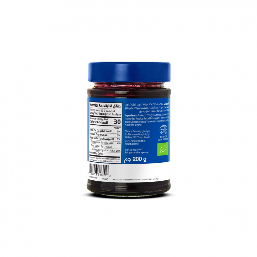 Ingredients: Mixed fruits 65% (strawberries, raspberries, blackberries, elderberry juice, blackcurrant), apple juice concentrate, lemon juice concentrate, pectin.